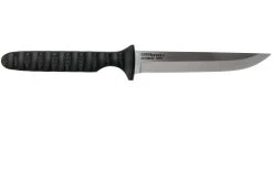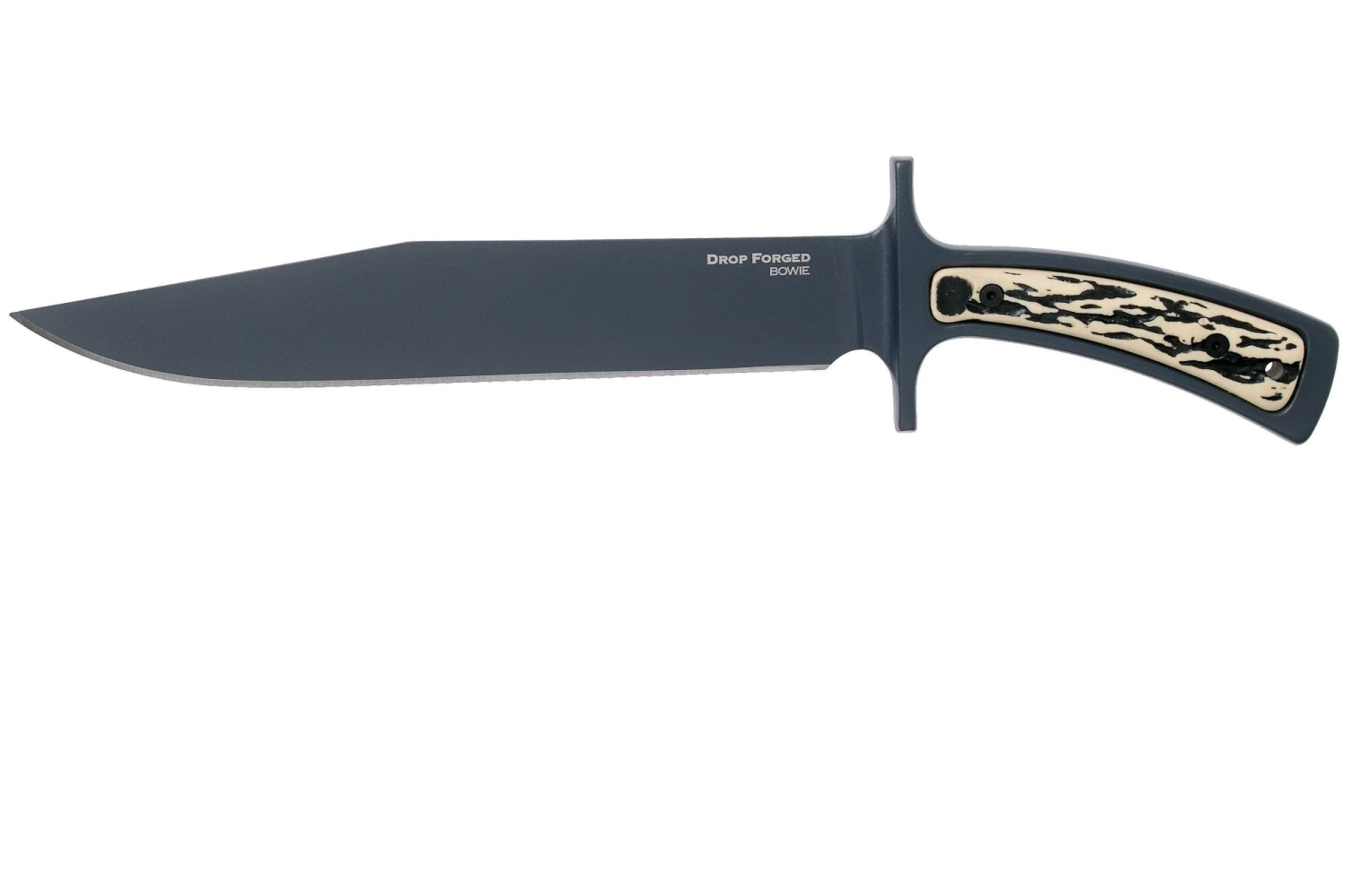 El Cold Steel 36MK Drop Forged Bowie es un notable cuchillo fijo. Lo más destacable es que fue forjado de una sola pieza de acero 52100, incluyendo el mango engrosado. El resultado es un cuchillo sólido y equilibrado que puede soportar un uso intensivo. La hoja tiene un afilado plano, por lo que el cuchillo sigue cortando con precisión, a pesar del grosor de la hoja. Las cachas de cuerno de ciervo de imitación están unidas al mango.