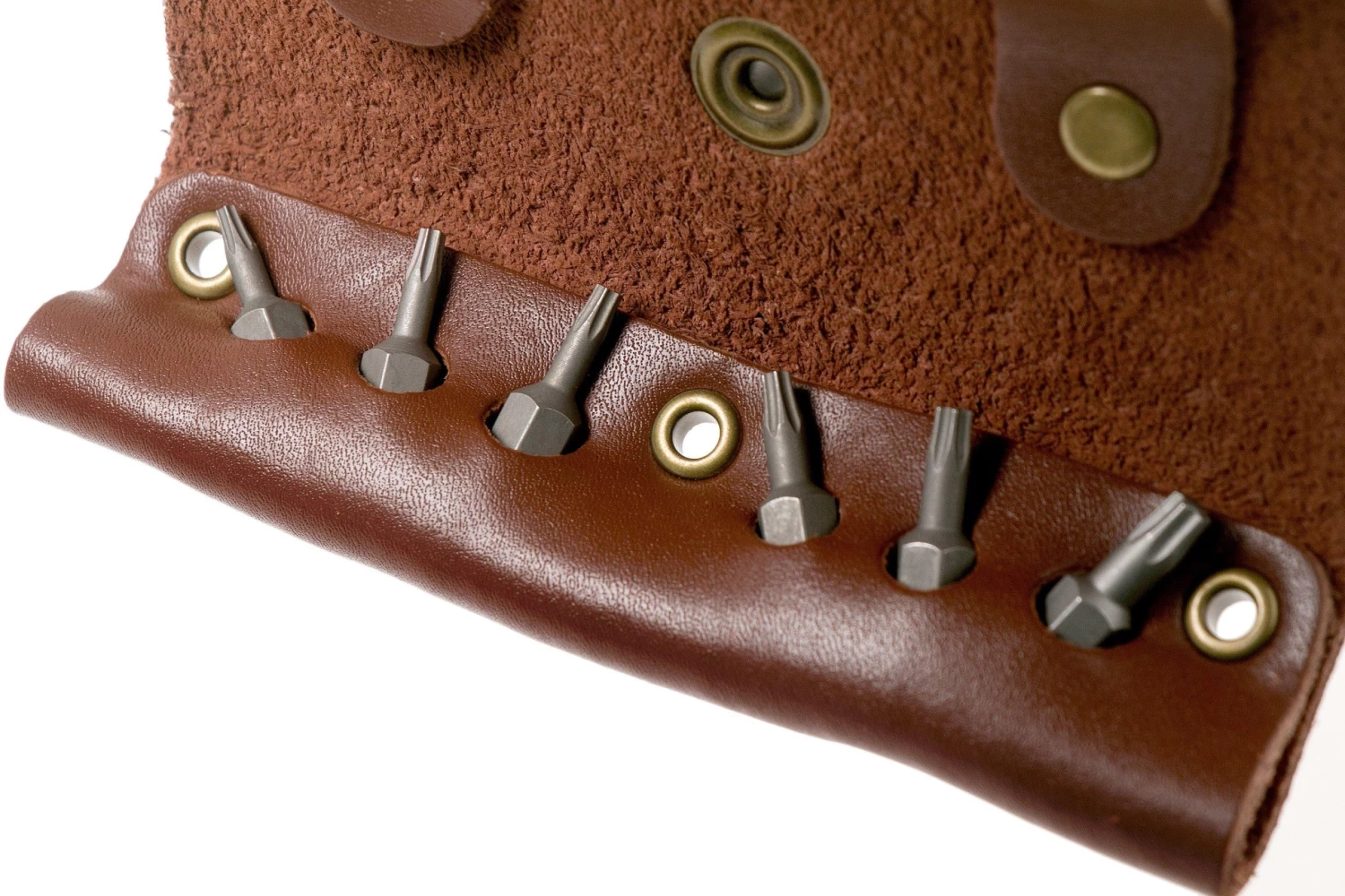El CRKT Hex Bit Driver Tool Roll 9911 es un genial juego de destornilladores con nada menos que ¡13 puntas diferentes! Con él tiene todas las piezas que pueda necesitar para mantener casi todas las navajas de bolsillo. Hoy en día existen muchos portapuntas diferentes en el mercado. Pero este es genial. Fabricado en latón macizo, tiene un rodamiento de bolas en el extremo para garantizar su facilidad de uso. Se sujeta esa parte a la palma de la mano para darle estabilidad, lo que significa que se tiene mucho control sobre la broca.