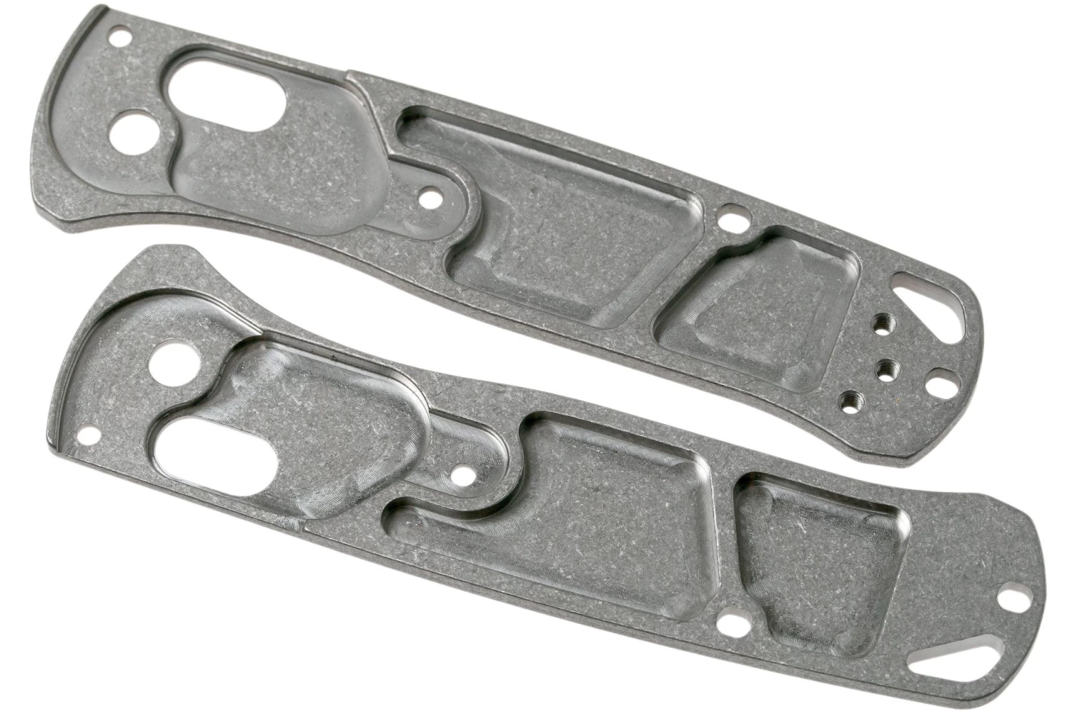 Estas Flytanium Benchmade Mini-Bugout Scales son grandes accesorios de posventa para la Benchmade Mini-Bugout. Son cachas bien ajustadas hechas por los expertos de Flytanium. Lo mejor de estas cachas es que Flytanium no se limitó a pegar el borde exterior de las antiguas cachas y lo dejó así. No: también hay una ranura biselada para el dedo índice. Y los agujeros que, en el caso de la navaja original, están mejorados con un agujero en forma de D para evitar que los tornillos giren, también tienen una bonita forma de D con estas cachas. No todas las cachas de posventa lo tienen.
