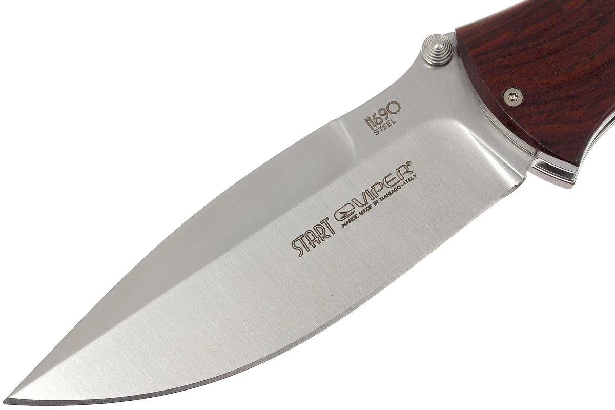 El Viper Start es un gran cuchillo con formas ergonómicas. La hoja de acero N690 está adelgazada hacia la parte posterior para ahorrar peso. Todos los filos están bien redondeados, lo que también puede verse en el muelle y los revestimientos. En combinación con los mangos de diseño ergonómico, este cuchillo resulta muy cómodo en la mano. La hoja se bloquea en la posición abierta mediante un robusto cierre trasero, llamado back-lock. Al principio puede que no funcione tan bien, pero eso mejorará con el tiempo. El extremo del mango tiene un espaciador oculto y un agujero para el acollador. Un hermoso y sutil detalle en un magnífico cuchillo.